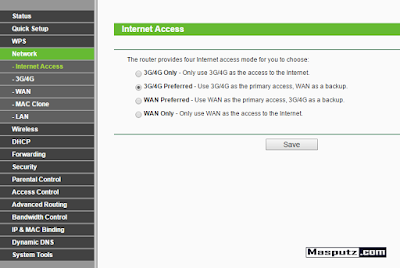 - Pilih menu Network kemudian Internet Access, Pilih 3G/4G Only atau preferred karena menggunakan modem USB, lalu klik save untuk menyimpan pengaturan.